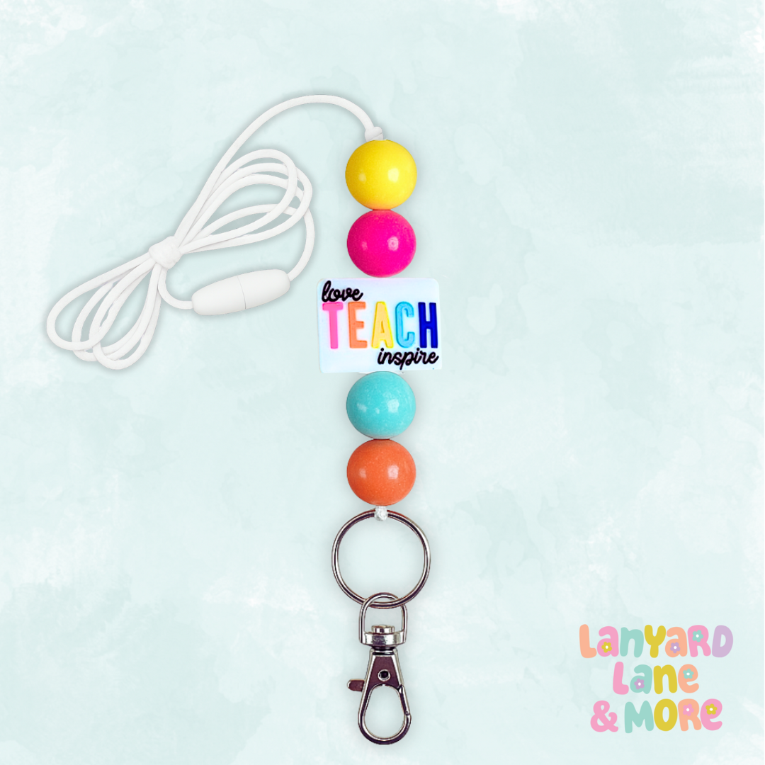 Bring positivity and color to your day with our Love • Teach • Inspire lanyard! This cheerful combo of yellow, pink, aqua, and orange beads is topped with a rainbow-inspired charm that says it all — love big, teach bold, and inspire daily. Lightweight and easy to wear, it’s the perfect blend of style and inspiration.