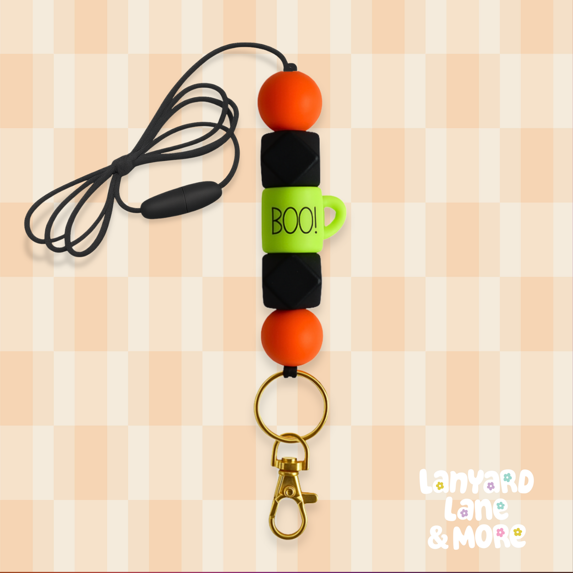 Add some spooky fun to your day with this Halloween lanyard—featuring bold orange, black, and neon green beads with a playful “BOO!” accent.