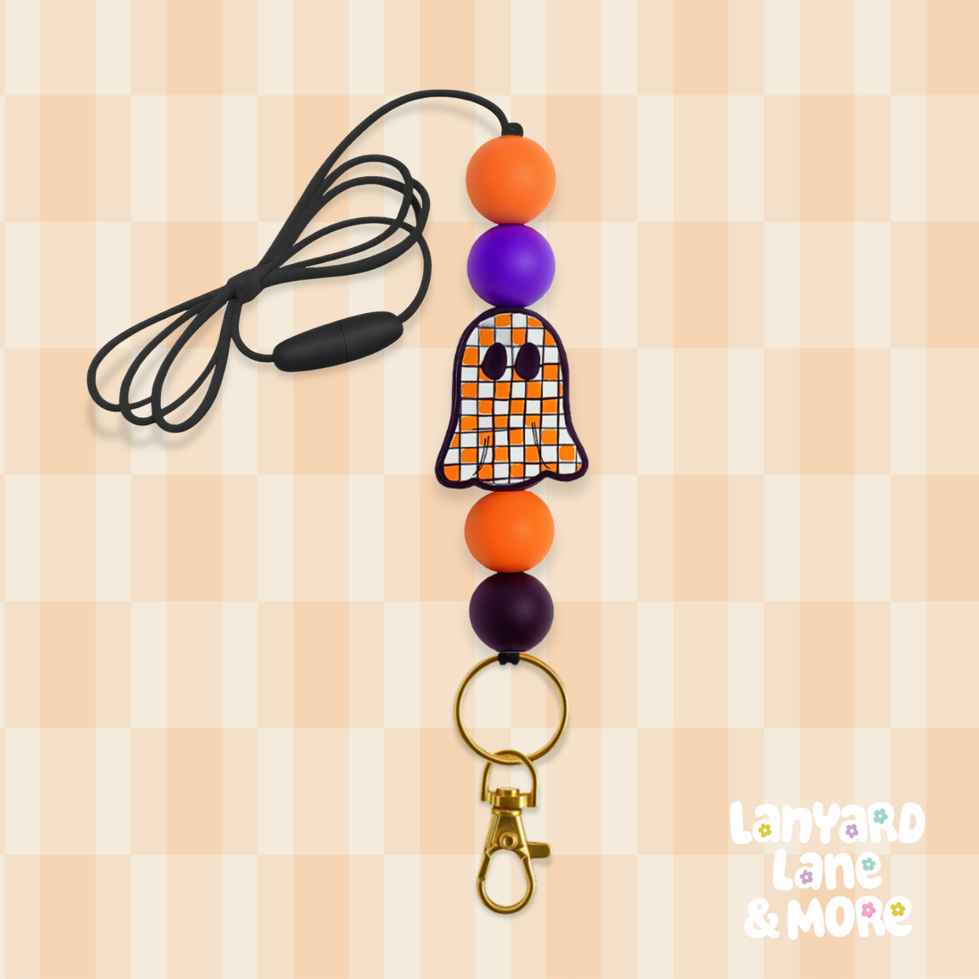 Get into the spooky spirit with this playful lanyard featuring bold orange and purple beads and a checkered ghost charm. Perfect for Halloween season while keeping your keys or ID close at hand.