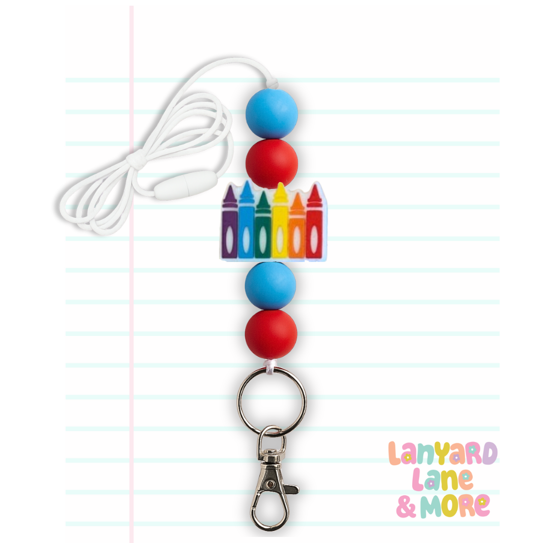 Brighten up your day with our Color Me Classroom lanyard! With cheerful blue and red beads and a row of rainbow crayons at the center, this design is pure teacher joy. Whether you’re grading papers or greeting students, it’s a playful pop of color that shows your creative side.