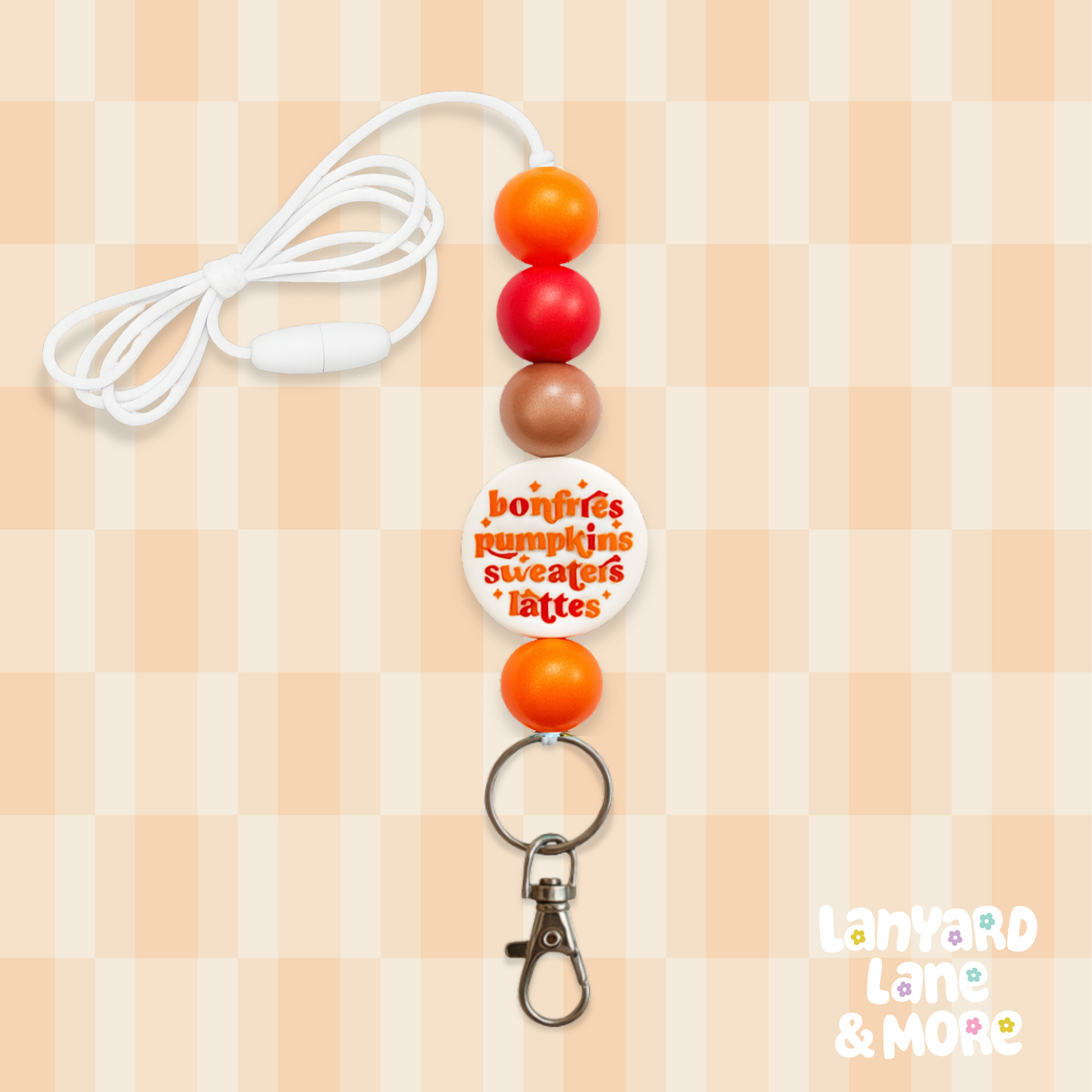 Celebrate all the cozy vibes of fall with this fun lanyard! Featuring warm seasonal beads and a charm that says bonfires, pumpkins, sweaters & lattes, it’s the perfect accessory for teachers, staff, or anyone who loves autumn.