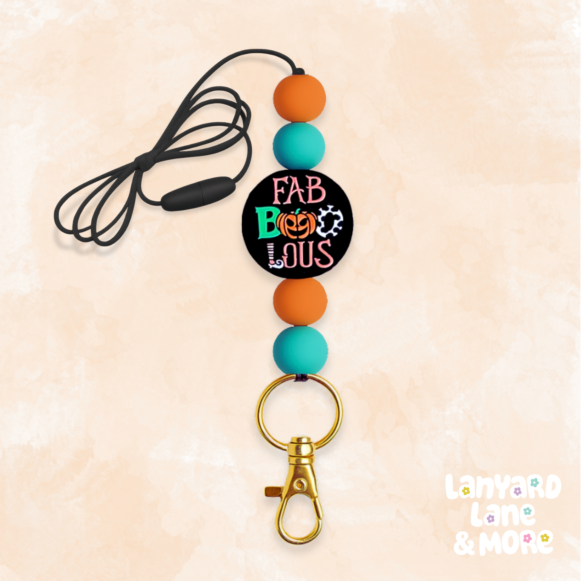 Add a little spooky sparkle to your day with this Fab-BOO-lous lanyard! Featuring bold teal and orange beads with a playful Halloween charm, it’s a fun way to keep your keys or badge handy while showing off your festive style.