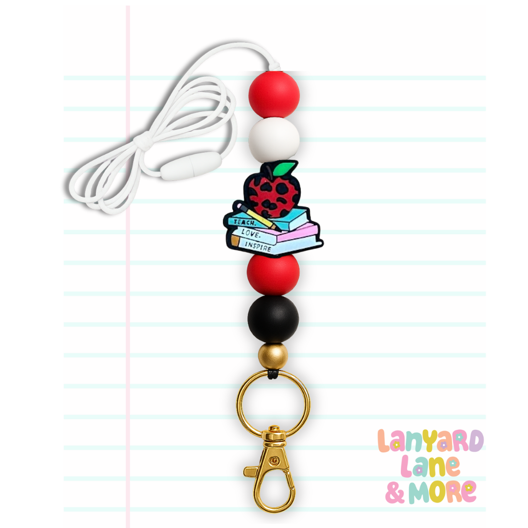 Show off your passion for teaching with our I Love to Teach lanyard! Featuring bright red, white, and black beads with a pop of gold and a cheerful apple-on-books charm, this design celebrates your teacher heart. It’s functional, durable, and stylish — the perfect accessory to keep your keys or badge close while adding a little classroom flair.