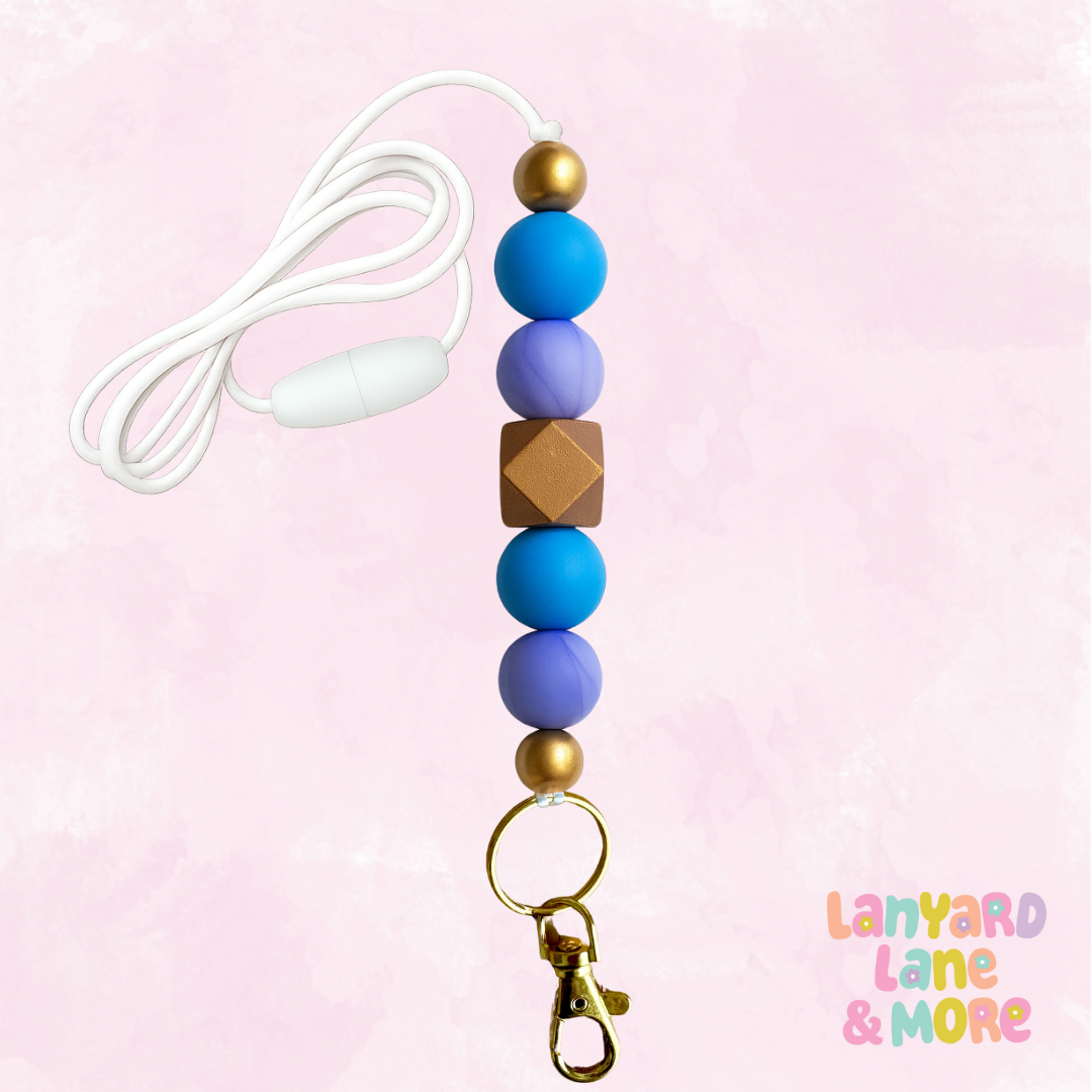 Calming lavender meets bold cobalt in this beautiful everyday lanyard. Finished with a gold geometric bead for a touch of shine and paired with a white cord, it’s the perfect pop of color to brighten your workday.
