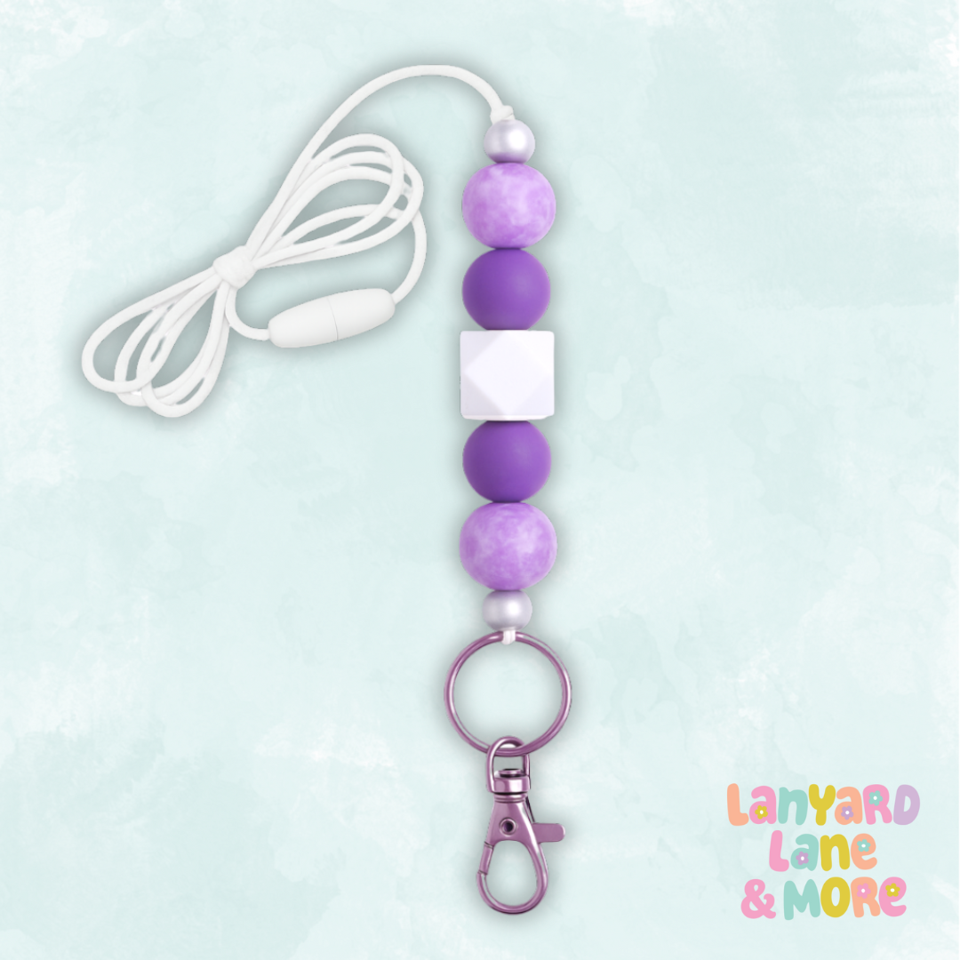 Soft marbled lavender meets rich purple in this elegant everyday lanyard. Accented with white and pearl beads and finished with coordinating lavender hardware, it’s the perfect blend of style and sophistication for teachers, professionals, or anyone who loves a little pop of purple.