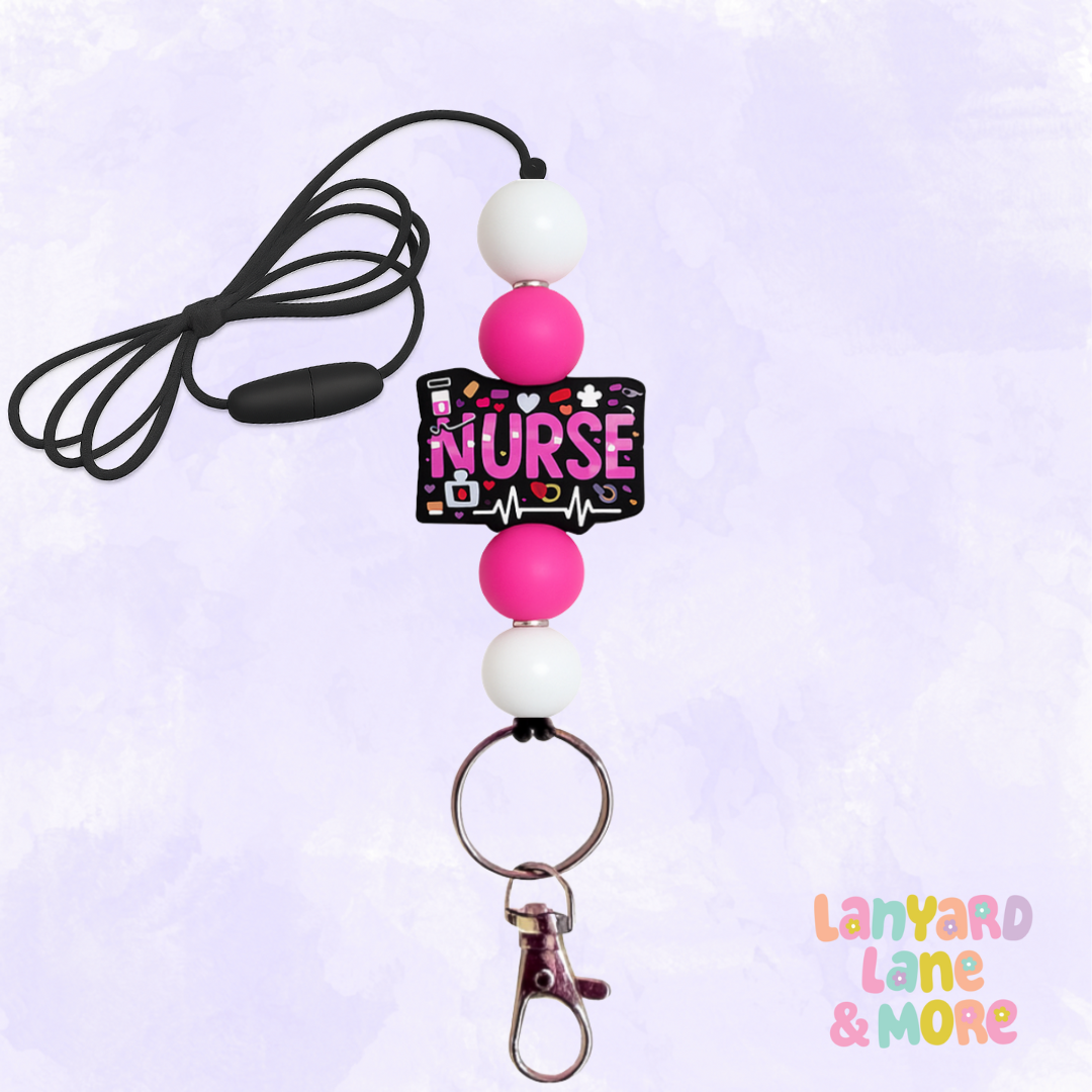 The Nurse Life Lanyard is designed to keep your essentials close while showing off your nursing pride. Featuring bold pink and white silicone beads with a playful “NURSE” focal bead, this lanyard is both stylish and practical. Built with a strong nylon cord, breakaway safety clasp, and finished with a metal keyring and swivel hook, it’s perfect for holding your badge, keys, or small tools during long shifts.