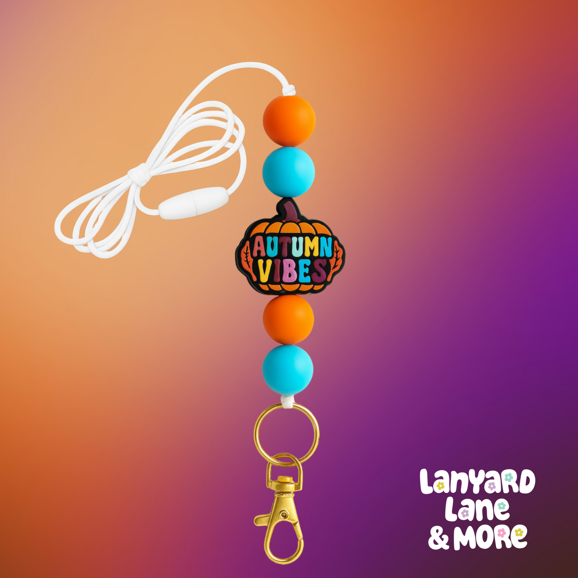 Bring cozy fall flair to your everyday look with our Autumn Vibes Lanyard. Featuring bold orange and aqua beads paired with a playful pumpkin charm, this lanyard is perfect for teachers, moms, and anyone who wants to add seasonal style to their routine. The gold hardware adds a polished finish, while the breakaway white cord ensures comfort and safety.