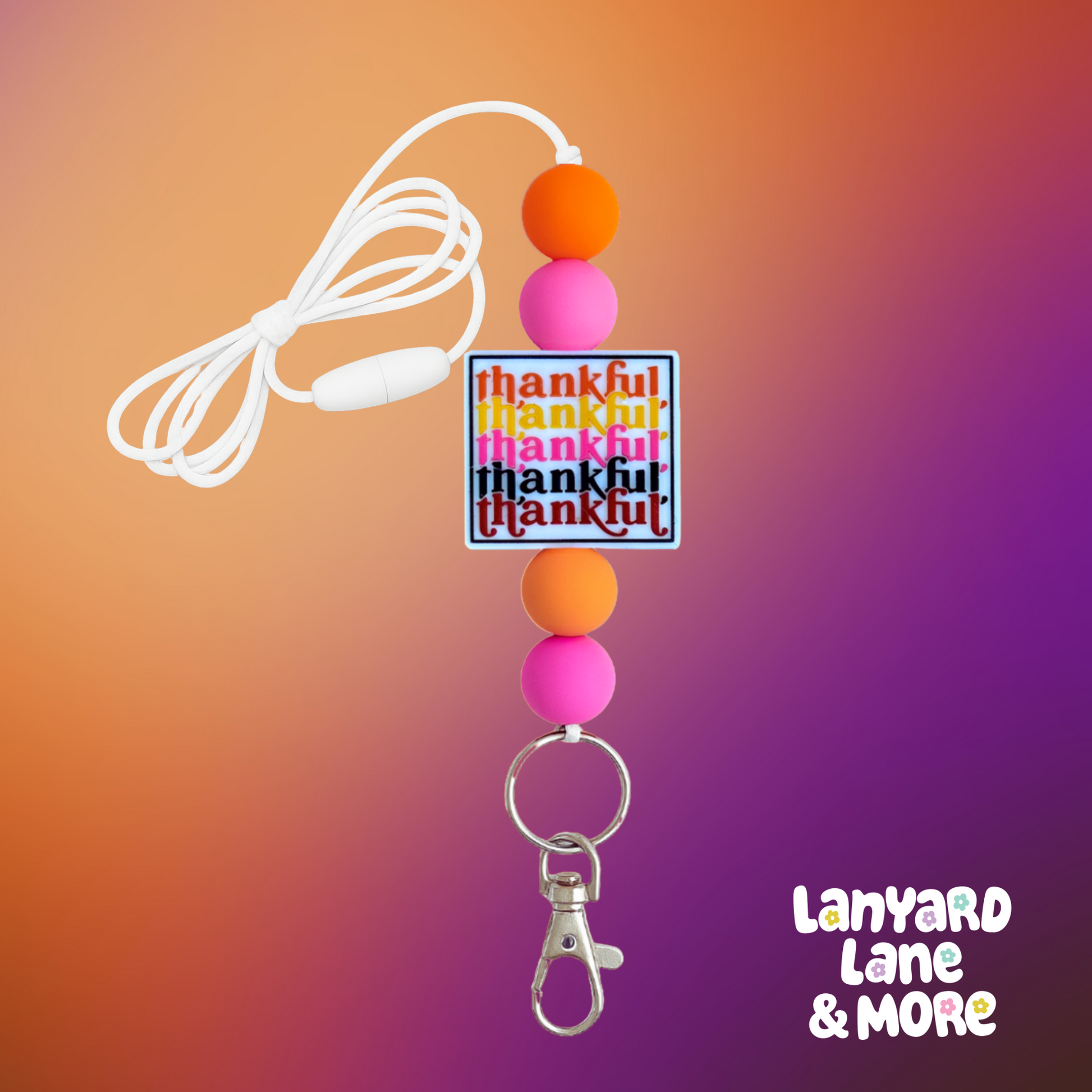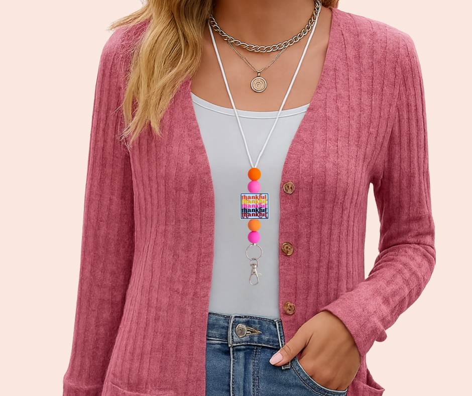 Celebrate gratitude in style with our Thankful Vibes Lanyard. Designed with bold orange and pink beads, paired with a colorful “thankful” statement charm, this lanyard is a cheerful reminder of the season’s joy. Perfect for teachers, moms, and anyone who loves carrying positivity wherever they go.