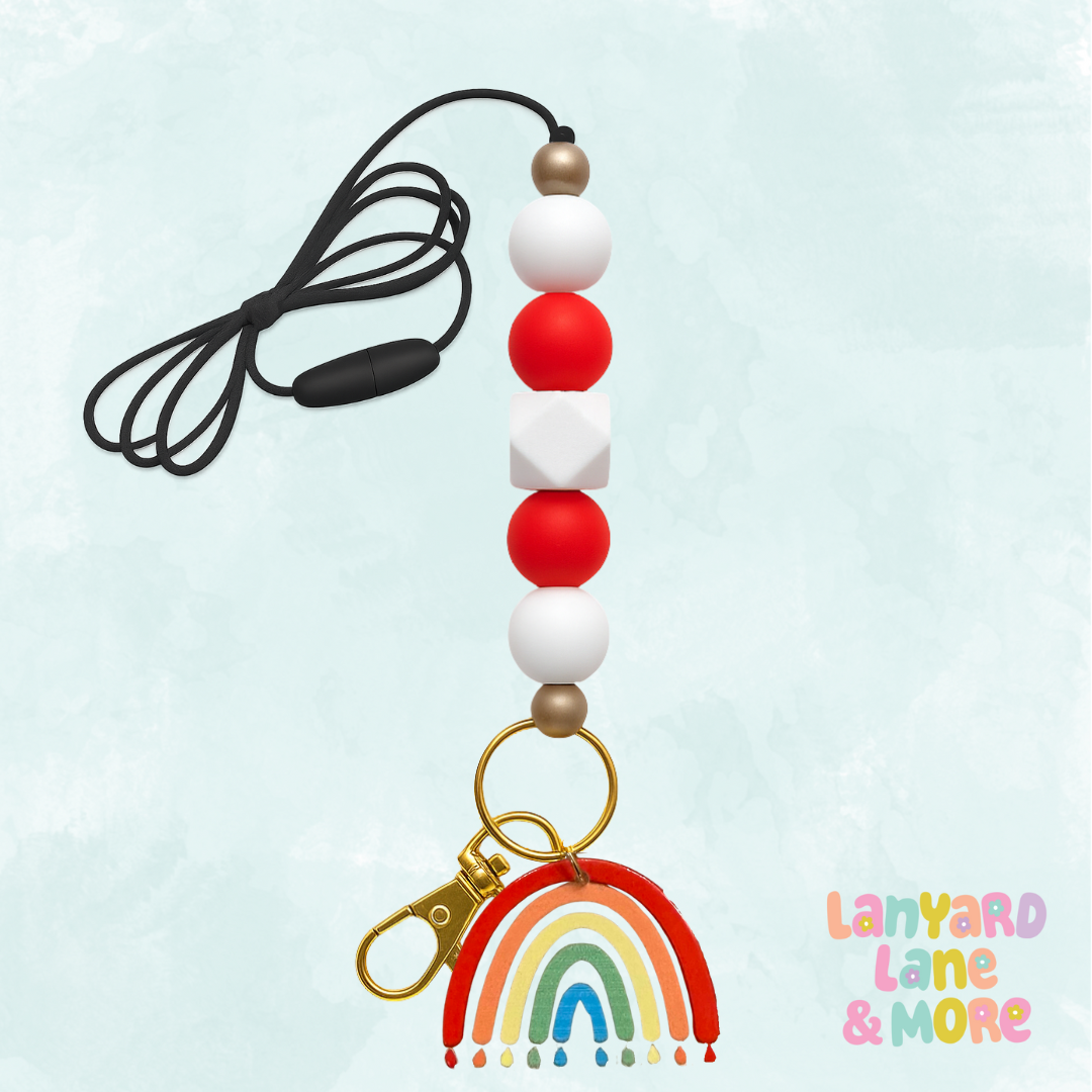 Bright, cheerful, and full of good vibes — Radiant Days is a reminder to find joy in the little things. Bold red and crisp white beads pop against warm gold accents, while the soft rainbow charm brings a touch of sunshine to your everyday routine. Finished with sleek black cording and gold hardware, this happy-go-lucky lanyard is perfect for teachers, nurses, or anyone who loves color and positivity!