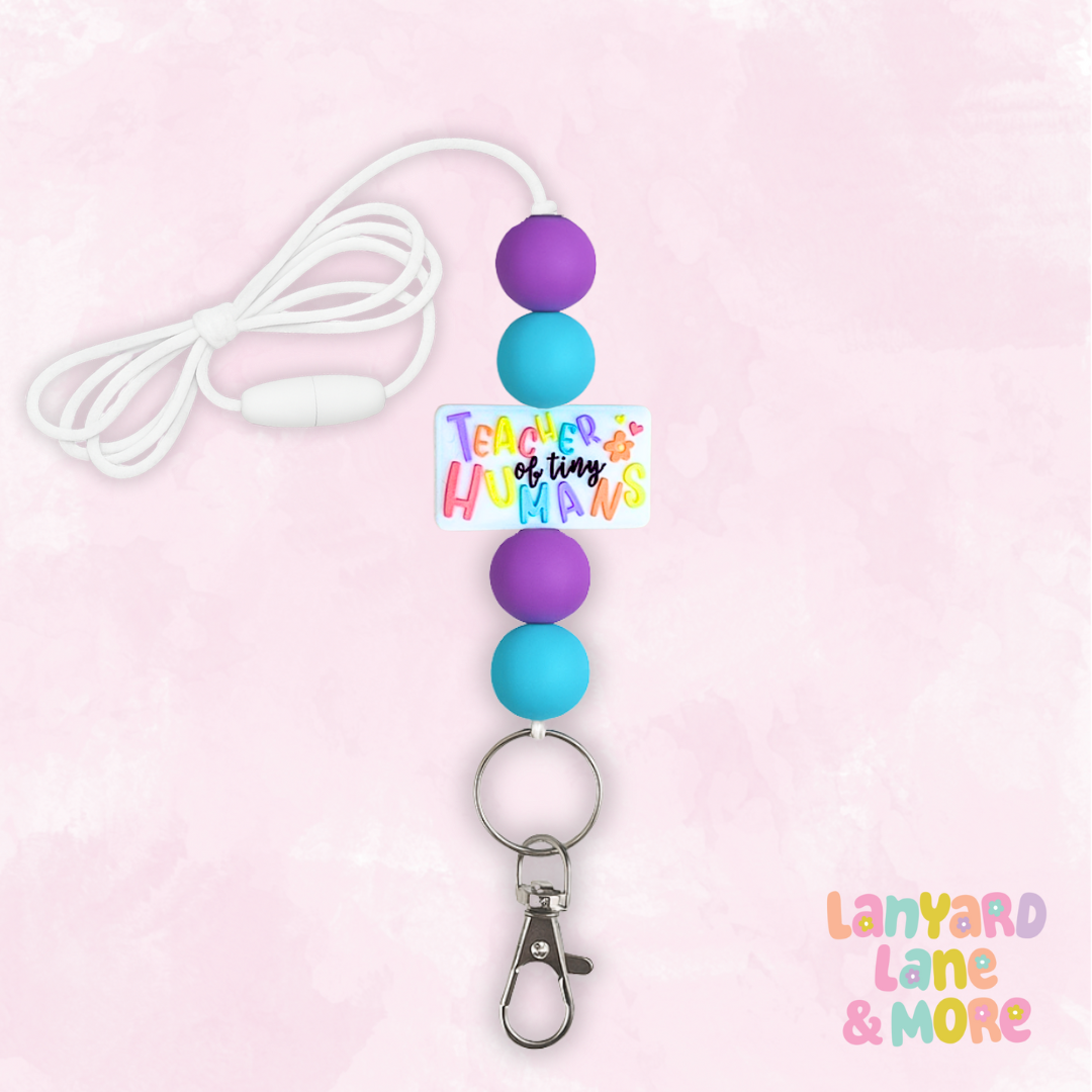 Celebrate the joy (and chaos!) of teaching little ones with our Teacher of Tiny Humans lanyard! Featuring cheerful aqua, purple, and silver beads with a playful rainbow-style charm, this design is as fun and colorful as your classroom. Lightweight, durable, and bursting with personality — it’s the perfect accessory for preschool, kindergarten, or early elementary teachers who love what they do.