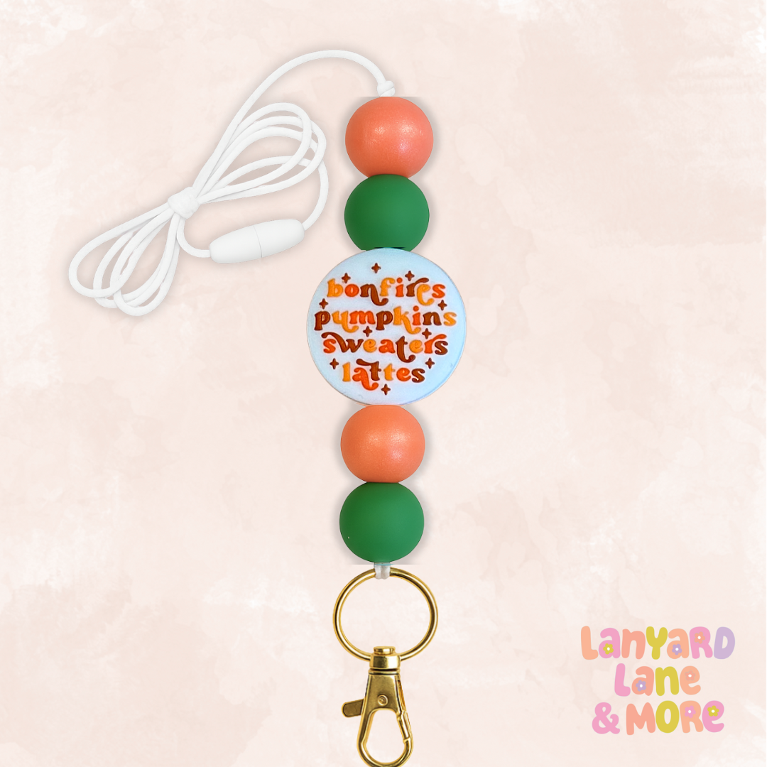 Bring cozy autumn vibes everywhere you go with our Bonfire Nights Lanyard. Featuring warm shades of burnt orange and forest green, this lanyard is finished with a playful bead that reads bonfires, pumpkins, sweaters, lattes — all the essentials of fall! 🍂 Perfect for teachers, staff, or anyone who loves a seasonal touch to their everyday look. Durable, lightweight, and stylish, it’s the ultimate accessory for work or errands.