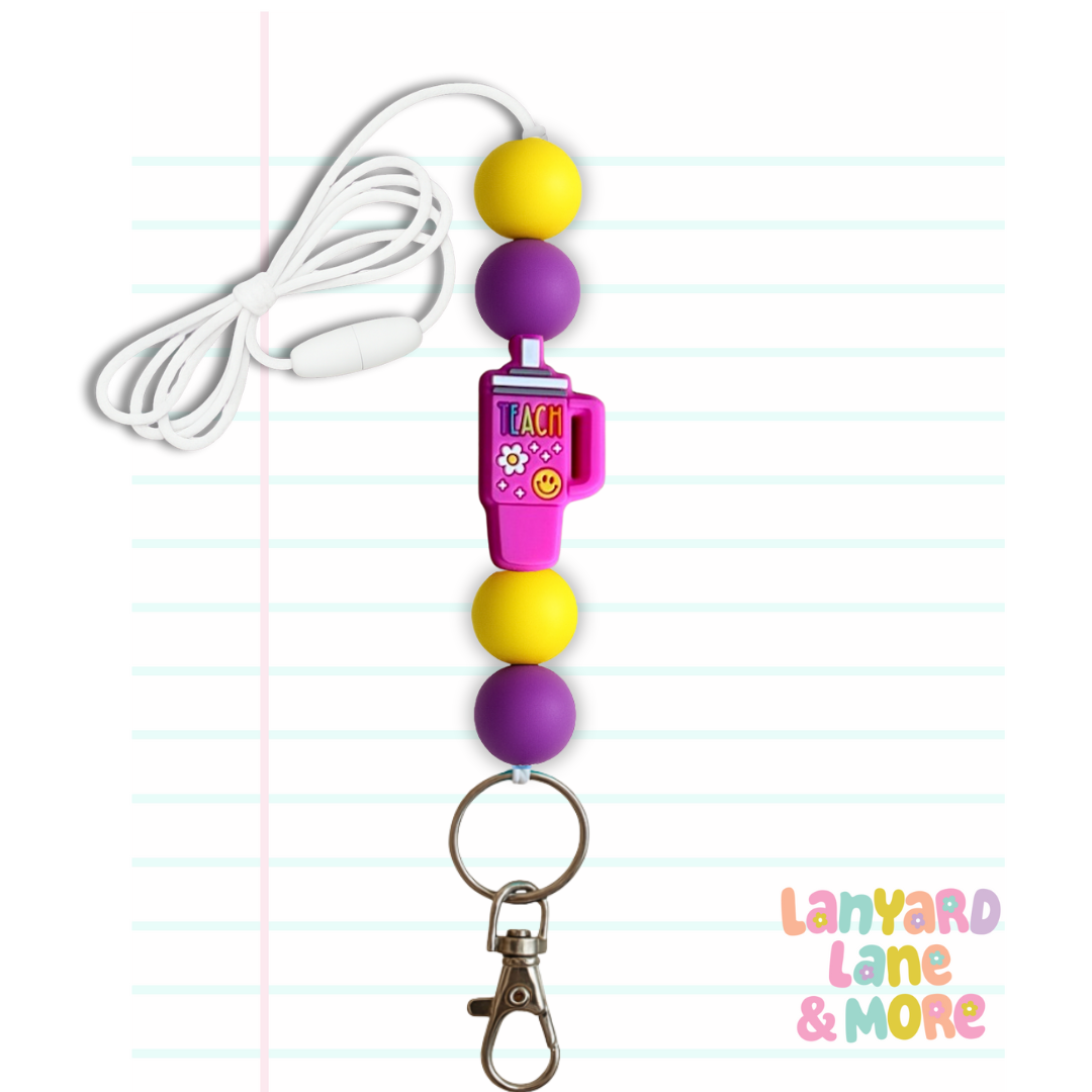 This cheerful Teach Fuel lanyard features bold purple and yellow beads with a bright pink “TEACH” tumbler charm that celebrates every teacher’s caffeine-powered spirit. Sturdy, lightweight, and full of personality — perfect for holding your ID, keys, or classroom must-haves.