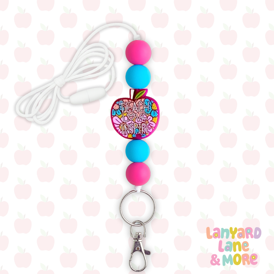 Bright, bold, and full of heart — this Teach • Love • Inspire lanyard is designed for teachers who bring creativity and kindness to the classroom every day. Featuring cheerful pink and turquoise silicone beads paired with a colorful apple accent, this lightweight lanyard adds a fun pop of color while keeping your keys and ID close at hand. With a breakaway clasp for comfort and safety, it’s the perfect blend of practicality and personality — a daily reminder that teaching truly makes a difference!