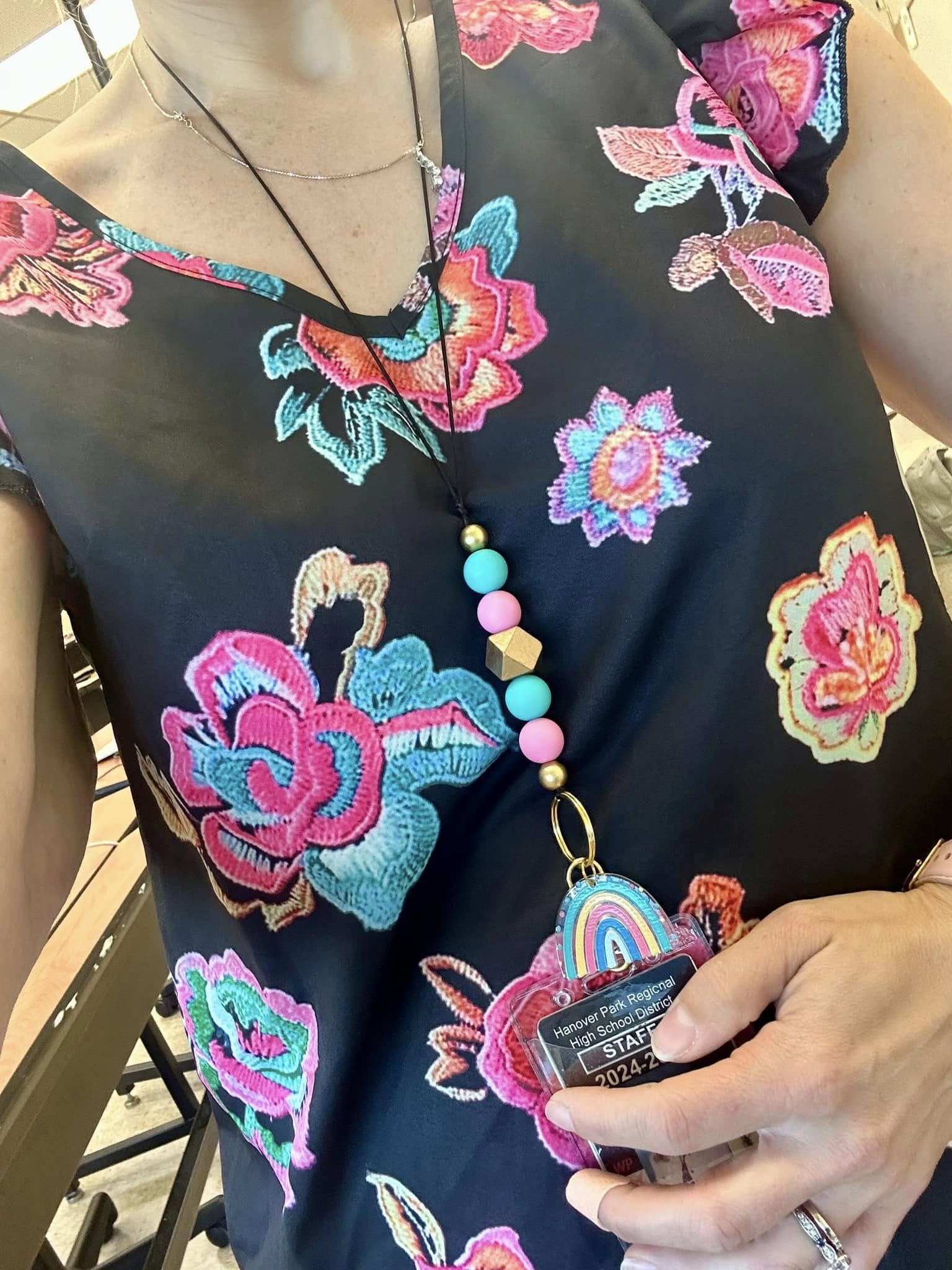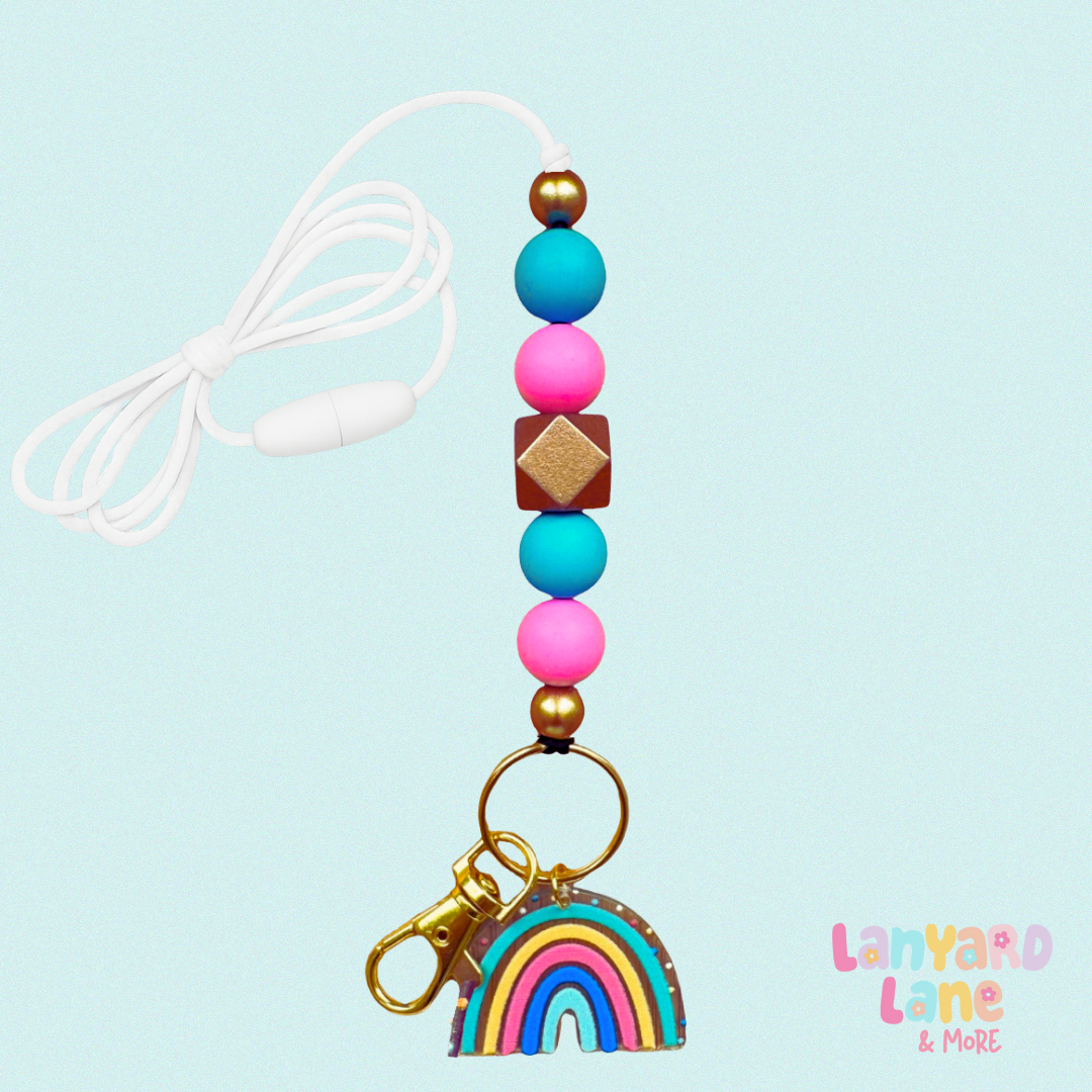 The Rainbow Dreams Lanyard adds a cheerful pop of color to your everyday style. Featuring a mix of turquoise, pink, and gold silicone beads with a geometric accent, it’s finished with a playful rainbow charm and gold hardware. Lightweight yet durable, this lanyard is perfect for keeping your keys, badge, or essentials close at hand. Available with or without acrylic rainbow pendant.